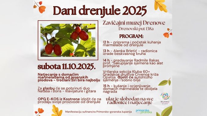 U subotu 11. listopada 2025. od 12 do 18 sati održat će se središnji dio manifestacije Dani drenjule 2025. u dvorištu Zavičajnog muzeja Drenove na adresi Drenovski put 138a.